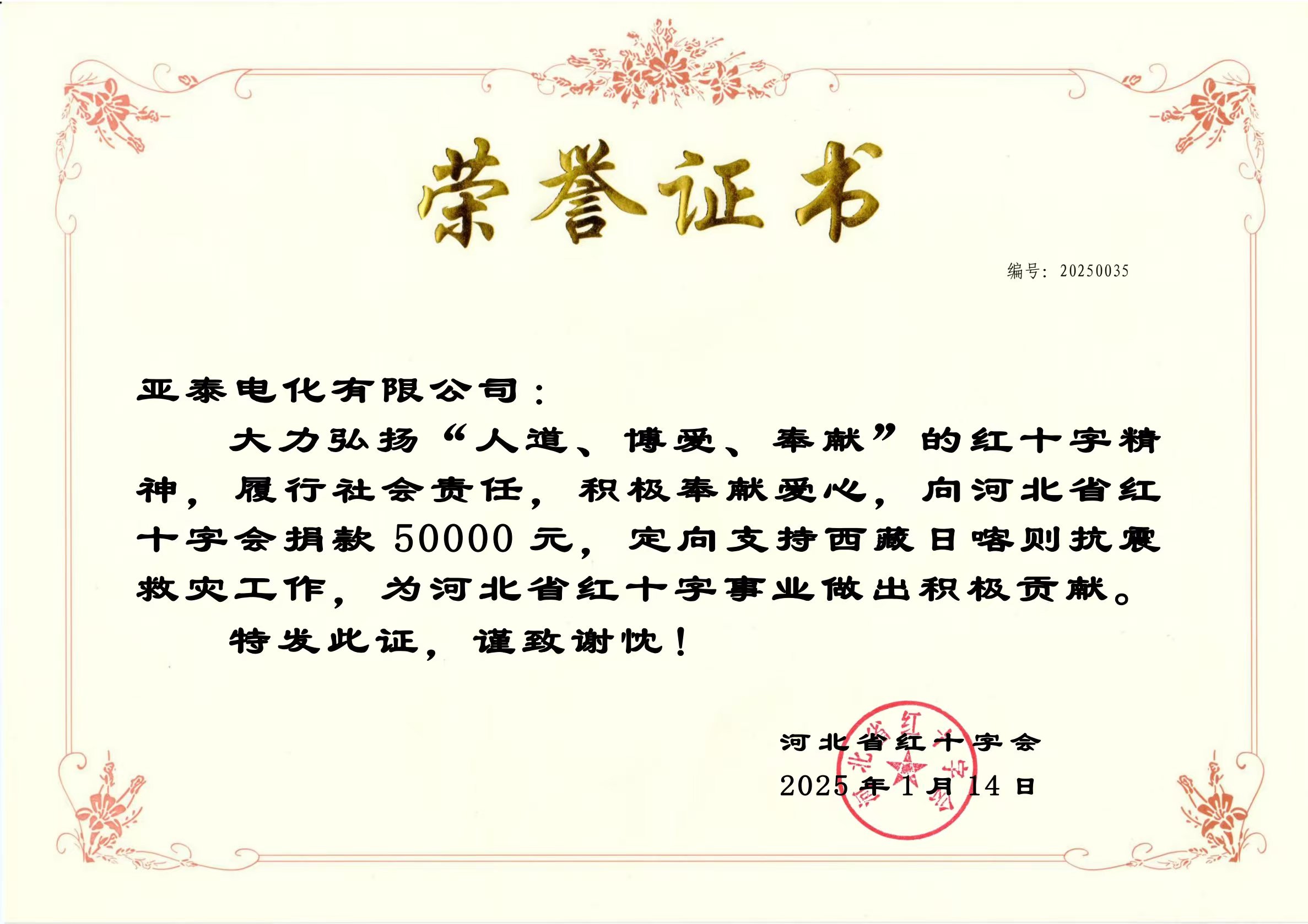 在公司領(lǐng)導(dǎo)的果斷決策下,第一時(shí)間從“亞泰愛心基金”中撥款5萬元人民幣,通過河北省紅十字會(huì),定向支援西藏日喀則的抗震救災(zāi)工作。我們希望通過這份綿薄之力,為災(zāi)區(qū)人民帶去一絲溫暖和希望。